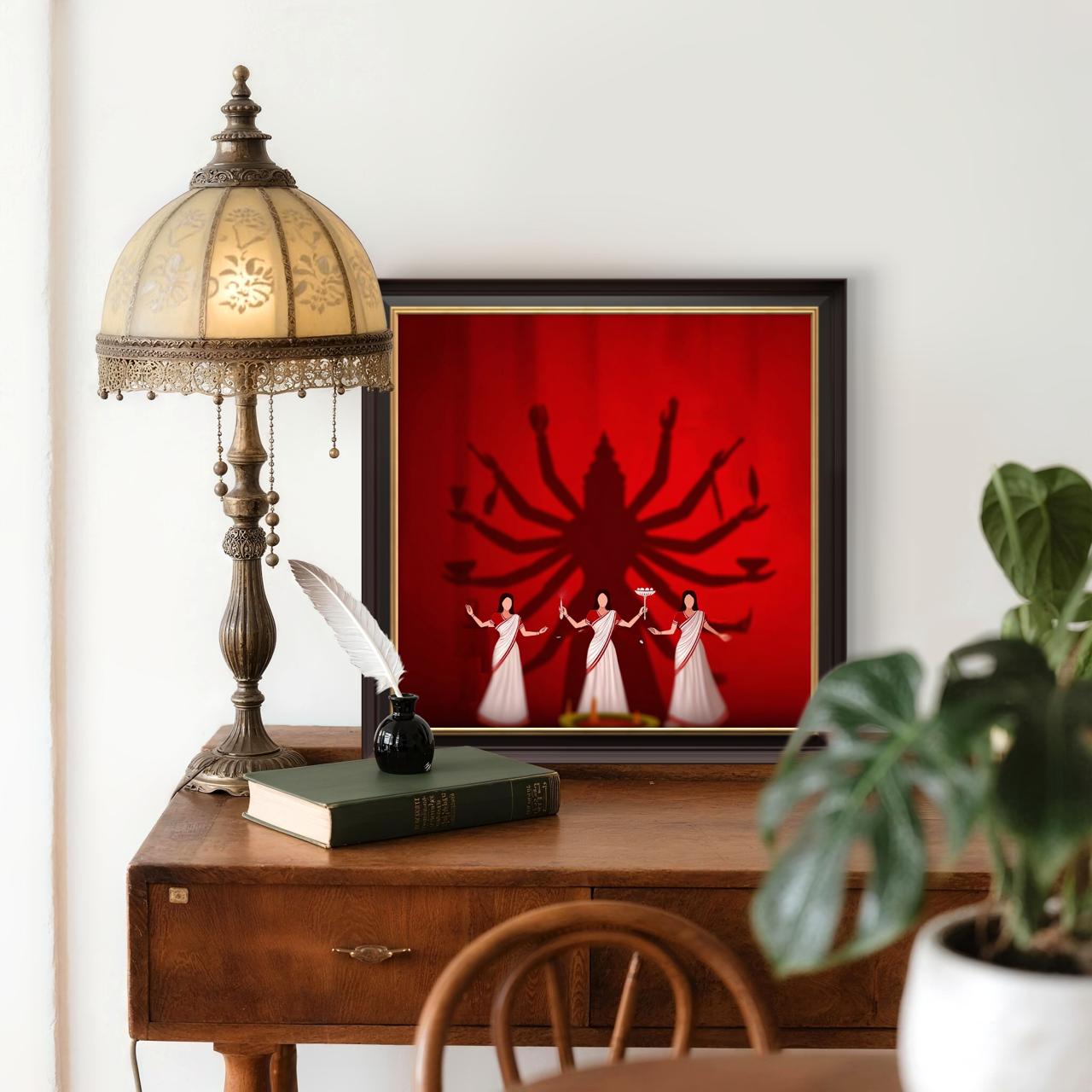 This powerful image shows three women performing aarti, their shadows uniting to form the ten-armed silhouette of Goddess Durga. It symbolizes the divine feminine energy present in every woman, reminding us that the Shakti we worship during Durga Puja also lives through devotion, unity, and the everyday strength of women.